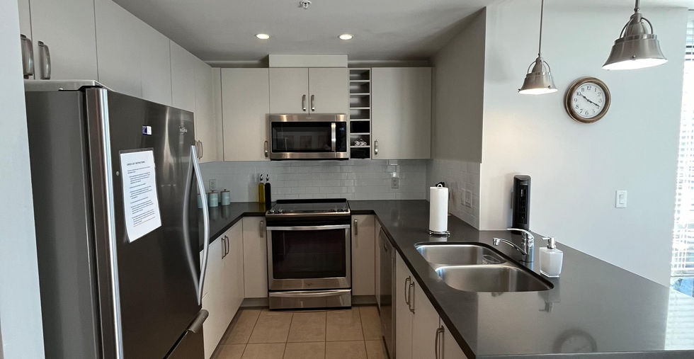 Rent includes all utilities, high-speed WiFi, and cable TV with two televisions. The unit also comes with in-suite laundry, a small storage locker, and a fully equipped kitchen, complete with dishes, cookware, small appliances, and linens. Secure underground parking is available for an additional $180 per month.